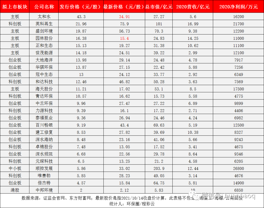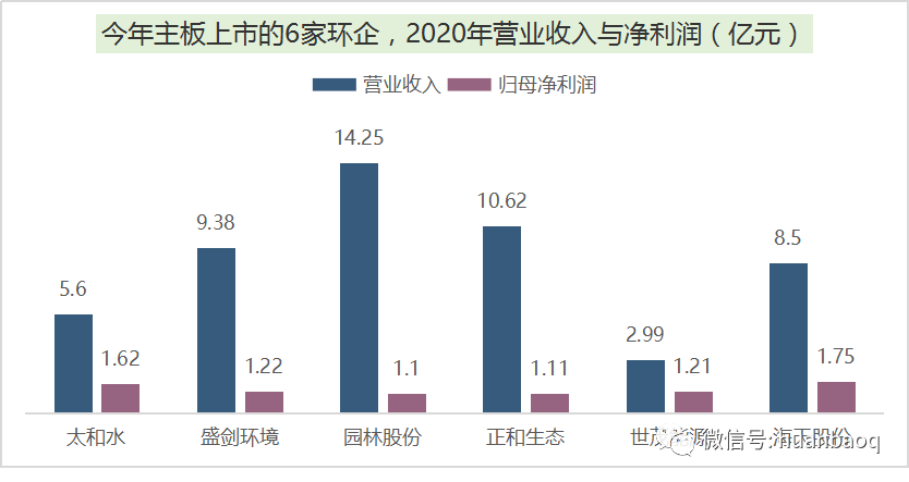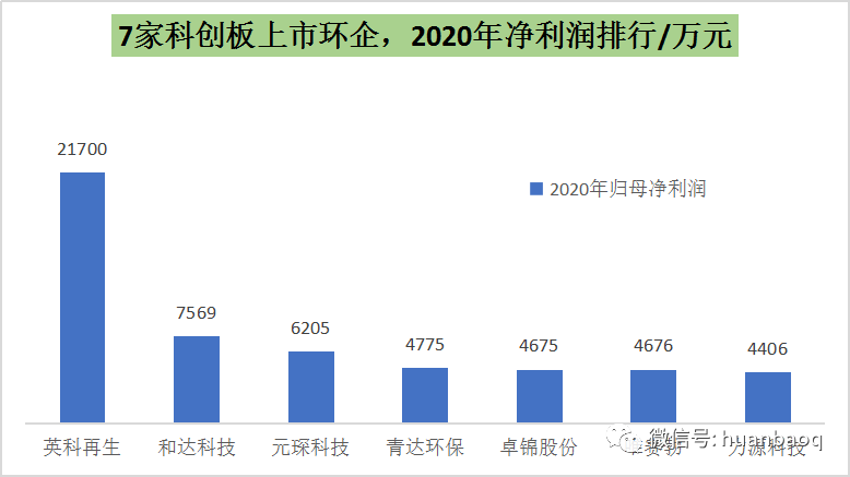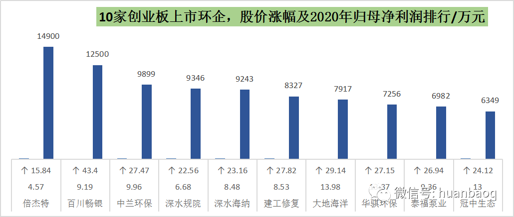 接下來,再說說大家比較關(guān)心的,今年上市企業(yè)的股價(jià)漲幅、最新市值和盈利水平。我們選擇主板、創(chuàng)業(yè)板、科創(chuàng)板上市的企業(yè)分別進(jìn)行對(duì)比。今年在主板上市的共有7家企業(yè),分別為太和水、園林股份、海天股份、盛劍環(huán)境、世茂能源、正和生態(tài)和宇通重工,由于宇通重工是通過大股東摘帽變更方式上市而來,暫且不對(duì)其進(jìn)行評(píng)價(jià)。剩下6家企業(yè)中,根據(jù)10月14日的收盤價(jià),太和水和園林股份竟然跌破發(fā)行價(jià),尤其是太和水,從發(fā)行價(jià)的43.3元/股跌至34.91元/股,總市值蒸發(fā)了近14億元。而同為主板上市的盛劍環(huán)境則表現(xiàn)極佳,這家從事半導(dǎo)體廢氣治理、煙氣凈化的公司,在國內(nèi)半導(dǎo)體產(chǎn)業(yè)大發(fā)展背景下,股價(jià)從19.87元/股漲至56.73元/股,總市值升至70.3億元,成為今年主板上市市值最高環(huán)保企業(yè)。這6家主板上市環(huán)企,2020實(shí)現(xiàn)營業(yè)收入大多位于5億元-14億元之間,歸母凈利潤也大多在1億元-2億元,營收最高的是杭州園林股份的14.25億元,凈利最高的則是成都海天股份的1.75億元。自上市以來,海天股份動(dòng)作頻頻,半年前還收購了新開元等4座污水廠,然后又?jǐn)M與康恒合資開公司,開拓四川垃圾焚燒/固廢業(yè)務(wù)。▼圖七:6家主板上市環(huán)企,2020年?duì)I收與凈利潤相對(duì)于主板上市企業(yè)的表現(xiàn)平平,今年10家在創(chuàng)業(yè)板上市的環(huán)企,股價(jià)清一色迎來大增,從8元-9元小盤股漲至20元-40元的中小型股,大多翻了2倍,或許跟創(chuàng)業(yè)板估值起飛有關(guān)。其中,百川暢銀(垃圾填埋氣發(fā)電)和倍杰特(高鹽度工業(yè)廢水治理)值得一說,不是由于股價(jià)翻了幾翻,而是在于它們卓越的賺錢能力。相較于其他上市環(huán)企的幾千萬凈利,去年在飽受疫情沖擊的情況下,這兩家企業(yè)的凈利潤竟然都過了億,比老牌上市企業(yè)盈利能力還要強(qiáng)。▼圖八:10家創(chuàng)業(yè)板上市環(huán)企,2020年凈利潤排行接著,我們?cè)倏纯苿?chuàng)板,相對(duì)于去年的11家,今年科創(chuàng)板上市的環(huán)企只有7家,分別是英科再生、和達(dá)科技、青達(dá)環(huán)保、力源科技、卓錦股份、元琛科技、唯賽勃。這7家企業(yè),除了英科再生(塑料回收再生)2020年歸母凈利潤遙遙領(lǐng)先之外,其余幾家凈利潤都在幾千萬左右。值得一提的是膜企唯賽勃,去年?duì)I收和凈利潤雙雙下滑,其中凈利潤下滑30%至4674萬元,這也從側(cè)面說明了科創(chuàng)板企業(yè)過會(huì)門檻相對(duì)較低。▼圖九:7家科創(chuàng)板上市環(huán)企,2020年凈利潤排行