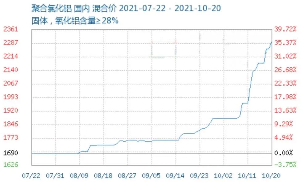 一起上漲的還有同樣的替代品,例如聚合氯化鋁在10月上半月上漲17%左右,主要原因是上游原材料鹽酸企業(yè)檢修增多,供應減少,下游采購積極性加強,市場供不應求,導致鹽酸價格偏緊。