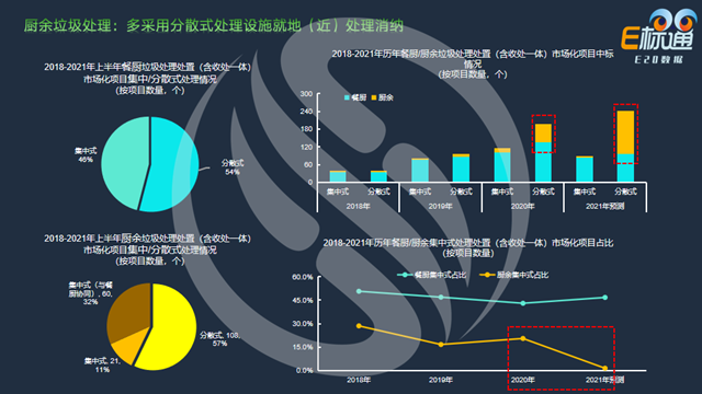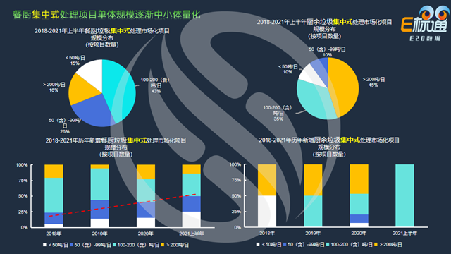 左邊兩圖分別是餐廚和廚余垃圾分散式和集中式處理方式占比情況,2018至2021上半年餐廚垃圾(左上圖)利用分散式方式處理的項(xiàng)目占比為54%,廚余垃圾(左下圖)利用分散式處理的占比更高一些(57%);此外,廚余垃圾的集中式處理方式又分為兩種情況,一種是純廚余垃圾建廠處理的集中式處理模式,另一種是和餐廚垃圾廠協(xié)同處理的集中式處理模式,在總量中占比分別為11%和32%。
