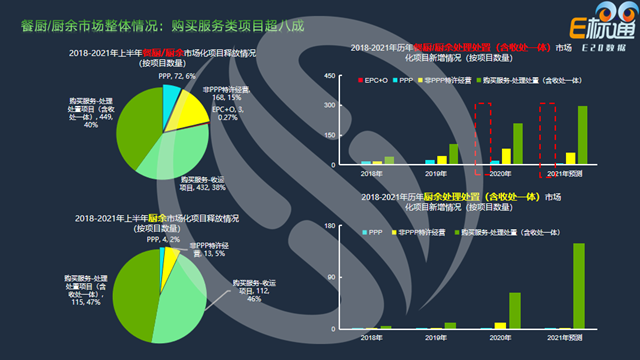 首先來看餐廚/廚余垃圾處理市場(chǎng)的整體情況。從左上圖,可以看到2018-2021年上半年,市場(chǎng)釋放的餐廚/廚余垃圾市場(chǎng)化項(xiàng)目以購買服務(wù)模式為主;右上圖是餐廚/廚余垃圾處理處置(含收處一體)市場(chǎng)化項(xiàng)目的歷年新增情況,2020年開始出現(xiàn)“EPC+O”模式的項(xiàng)目。