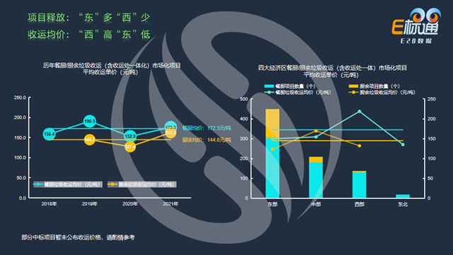 聚焦收運(yùn)環(huán)節(jié),近三年餐廚垃圾收運(yùn)均價(jià)為172.3元/噸,廚余垃圾收運(yùn)均價(jià)為144.8元/噸,左圖是歷年餐廚/廚余垃圾收運(yùn)(含收運(yùn)處一體化)市場(chǎng)化項(xiàng)目平均收運(yùn)價(jià)格的情況;右圖是四大經(jīng)濟(jì)區(qū)餐廚/廚余垃圾平均收運(yùn)單價(jià)情況,其中:西部地區(qū)的餐廚垃圾收運(yùn)均價(jià)較高,中部地區(qū)廚余垃圾的收運(yùn)價(jià)格較高,E20研究院數(shù)據(jù)研究中心認(rèn)為中西部地區(qū)收運(yùn)價(jià)格偏高或與收運(yùn)距離有關(guān)。
