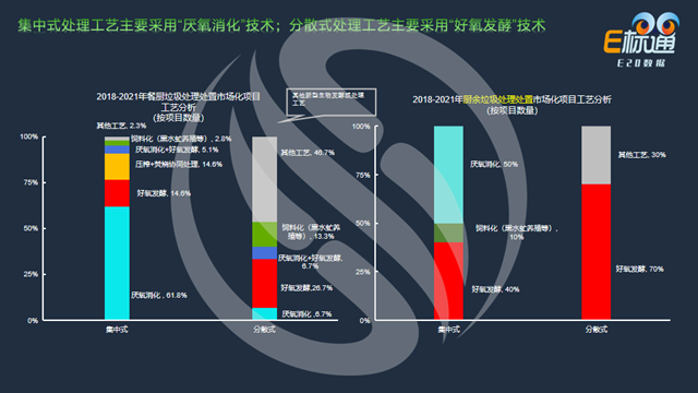 從處理工藝角度分析,左圖是餐廚垃圾處理處置市場(chǎng)化項(xiàng)目工藝分析占比圖,其中集中式處理方式主要采用的技術(shù)工藝是厭氧消化技術(shù),占比為61.8%,分散式處理方式主要采用的是好氧發(fā)酵技術(shù)。