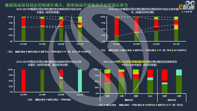 從社會(huì)資本維度看,上兩圖分別是按照項(xiàng)目數(shù)量和建設(shè)投資總額兩個(gè)維度的餐廚垃圾處理處置投資運(yùn)營類項(xiàng)目中標(biāo)社會(huì)資本情況占比圖。民企每年拿到的餐廚投運(yùn)項(xiàng)目的一半,并且所占的市場(chǎng)份額在逐年上升。左下面圖是廚余垃圾處理處置投資運(yùn)營類項(xiàng)目中標(biāo)社會(huì)資本情況。