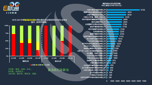 把中標(biāo)的社會(huì)資本按ABCD方陣劃分(A方陣主要指的是光大、首創(chuàng)、北控等這種重資產(chǎn)的固廢企業(yè),B方陣是類似北京環(huán)衛(wèi)、重慶環(huán)衛(wèi)等以地方國資控股的屬地性企業(yè),C/D方陣是維爾利、普拉克等以系統(tǒng)解決方案或者設(shè)備供應(yīng)等民營企業(yè)為主)。左圖可以看到歷年社會(huì)資本占比演變,餐廚垃圾投運(yùn)類項(xiàng)目在2018年時(shí),A方陣占比較多;到2021年上半年,C/D方陣占比在50%。廚余垃圾投運(yùn)類項(xiàng)目暫無B方陣參與市場(chǎng)化項(xiàng)目。