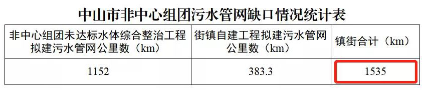▼截至2021年8月,中山市非中心組團污水管網(wǎng)缺口達到1535公里
