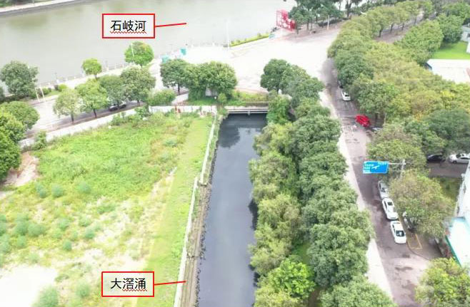 ▼2021年7月30日,督察組使用無人機拍攝,大滘涌水體發(fā)黑,與石岐河形成明顯對比