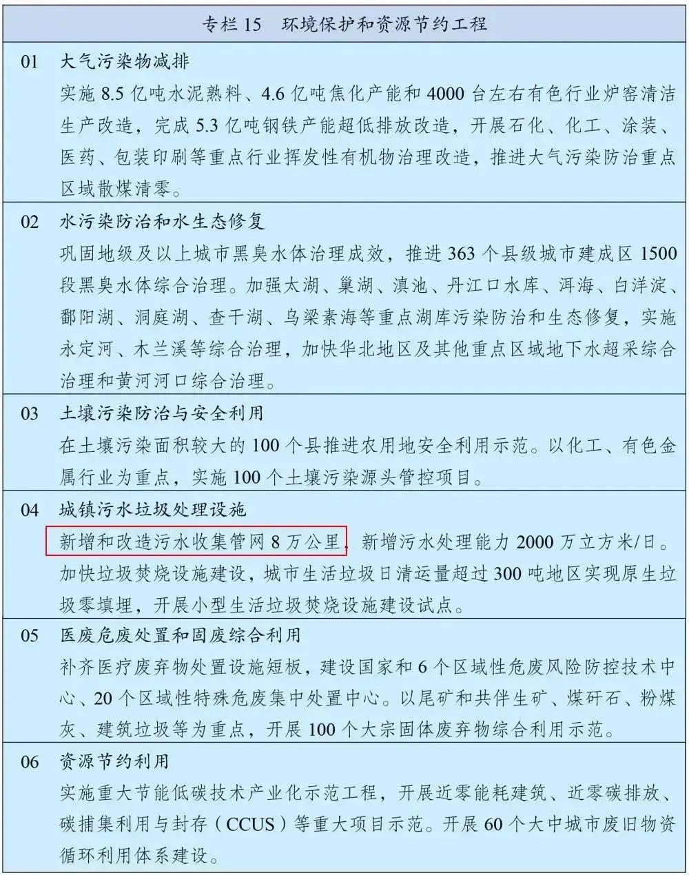 例如,在“十四五”規(guī)劃第三十八章第二節(jié)中,“推進城鎮(zhèn)污水管網(wǎng)全覆蓋”就排在精準提標、污泥無害化、污水資源化等之前,在水污染治理中位列第一。