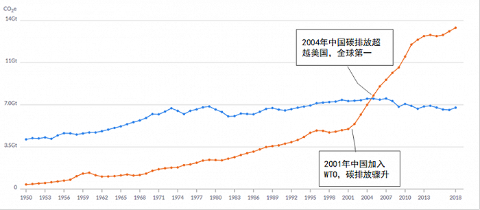 圖5:中美年碳排放對(duì)比。數(shù)據(jù)來(lái)源:PIK
