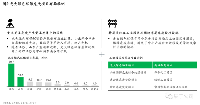 在危廢產(chǎn)量高的省份,頭部企業(yè)更是具有絕對(duì)優(yōu)勢(shì),例如光大綠色環(huán)保,一方面重點(diǎn)關(guān)注危廢產(chǎn)生量高度集中的區(qū)域,早早布局江蘇、山東兩個(gè)產(chǎn)廢大省和貯存大省,將其60%的產(chǎn)能都布局于此,兩省累計(jì)布局超過110萬(wàn)噸的產(chǎn)能,以此為基礎(chǔ),在江蘇、山東產(chǎn)能逐漸過剩時(shí),其最新的項(xiàng)目開始以江蘇為中心向東南各省擴(kuò)展;另一方面,他們也特別關(guān)注危廢產(chǎn)量高省份在工業(yè)園區(qū)及周邊布局危廢處理設(shè)施,擁有多個(gè)危廢項(xiàng)目布局在工業(yè)園區(qū)及周邊,保障危廢來源,避免了中小產(chǎn)廢企業(yè)遷移或關(guān)停造成拿料困難的情況(見圖2)。