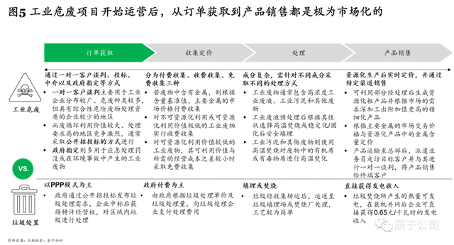 值得注意的是,工業(yè)危廢運(yùn)營(yíng)階段的競(jìng)爭(zhēng)同樣十分激烈,從來料獲取到產(chǎn)品銷售都極為市場(chǎng)化(見圖5)。以訂單獲取為例,工業(yè)危廢往往需要通過一對(duì)一客戶談判、投標(biāo)、中介以及政府指定等方式來展開,這與傳統(tǒng)的垃圾處置行業(yè)以PPP模式為主是截然不同的。