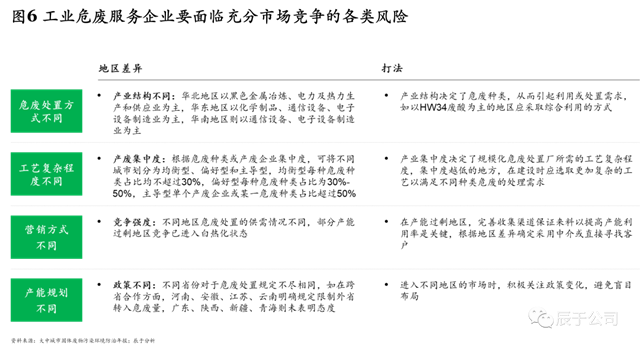 這不禁引起我們對(duì)這一市場(chǎng)的重新審視。通過對(duì)最新政策的解讀、對(duì)上游產(chǎn)廢企業(yè)的調(diào)研,以及與工業(yè)危廢企業(yè)的深入交流,我們?cè)诒緢?bào)告中仍將維持之前的判斷:相比其他細(xì)分市場(chǎng),有規(guī)模、有增速、盈利水平中上、行業(yè)集中度低的工業(yè)危廢市場(chǎng)仍然值得關(guān)注,只不過對(duì)后進(jìn)入者,當(dāng)前的競(jìng)爭(zhēng)環(huán)境確實(shí)“兇險(xiǎn)”,所面臨的四大挑戰(zhàn),讓他們想“彎道超車”變得困難重重: