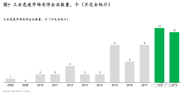 一是與市場(chǎng)需求種類不匹配,根據(jù)2019年最新修訂發(fā)布的《國(guó)家危險(xiǎn)廢物名錄》,我國(guó)危險(xiǎn)廢物分類共有46大類,471種,而我國(guó)90%以上危廢處置企業(yè)僅能處置5種或以下的危廢種類,供需種類錯(cuò)配的現(xiàn)象較嚴(yán)重;二是產(chǎn)能落后,處置規(guī)模小,技術(shù)和使用設(shè)備落后,無(wú)法滿足污染防治的要求;三是安全隱患突出,環(huán)境管理水平低下以及相關(guān)危險(xiǎn)廢物經(jīng)營(yíng)安全的規(guī)章制度不完善,導(dǎo)致環(huán)境安全隱患問題突出??梢灶A(yù)見的是,隨著市場(chǎng)競(jìng)爭(zhēng)日益激烈,“小而弱”的工業(yè)危廢企業(yè)將越來越難以適應(yīng)市場(chǎng)新要求,頻頻被“出清”。據(jù)不完全統(tǒng)計(jì),2010-2014年,每年關(guān)停的工業(yè)危廢服務(wù)企業(yè)僅為2——4家,2018和2019年則分別達(dá)到了13和12家(見圖7)。