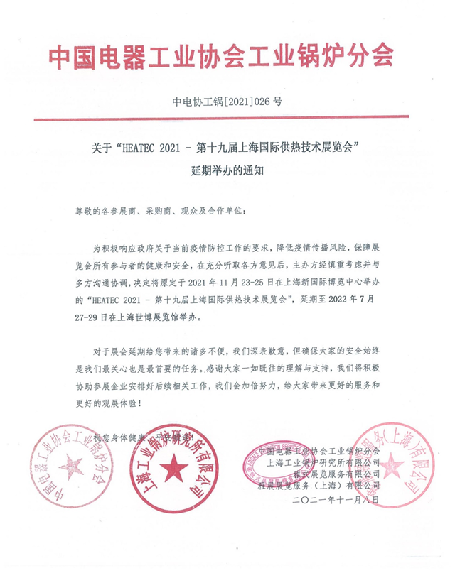 關(guān)于“HEATEC 2021 -第十九屆上海國(guó)際供熱技術(shù)展覽會(huì)”延期舉辦的通知