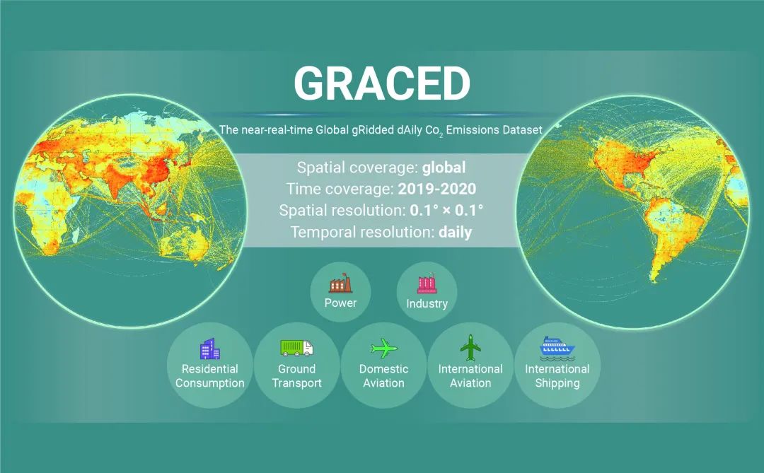 本研究提出了一種基于近實(shí)時碳排放量化方法和參數(shù)模型的碳排放空間表征模式,基于衛(wèi)星遙感數(shù)據(jù)、地面監(jiān)測數(shù)據(jù)與統(tǒng)計(jì)數(shù)據(jù)等多源數(shù)據(jù)耦合的云計(jì)算平臺,以高時空精度(天尺度,0.1度柵格)和高時效(近實(shí)時更新:僅滯后約一個月)方式進(jìn)行全球碳排放空間量化展示,構(gòu)建以天為單位的(自2019年1月1日起)全球首個近實(shí)時天尺度碳排放地圖—Global gRidded dAily CO2 Emissions Dataset(GRACED),為全球碳排放動態(tài)監(jiān)測及政策評估提供了重要的數(shù)據(jù)支撐。