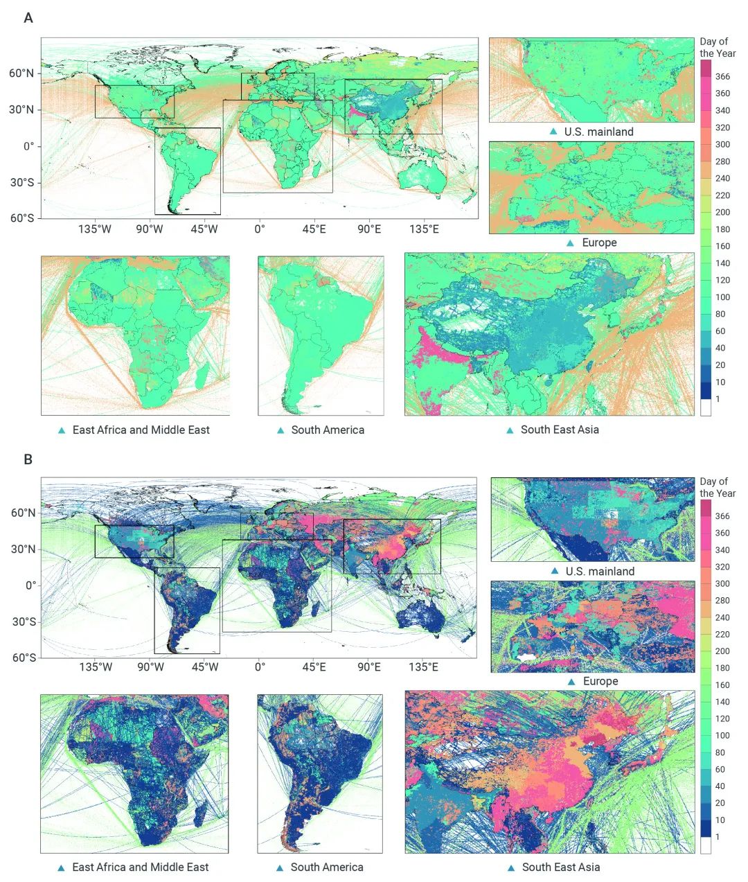 GRACED反映了全球不同區(qū)域受疫情影響排放大幅下降時間和后期經(jīng)濟(jì)復(fù)蘇排放顯著反彈時間的差異(圖6)。圖6A展示了全球不同區(qū)域最大碳排放降幅日的碳地圖,圖6B展示了最大反彈日的碳地圖。顏色越紅表明出現(xiàn)時間越晚。