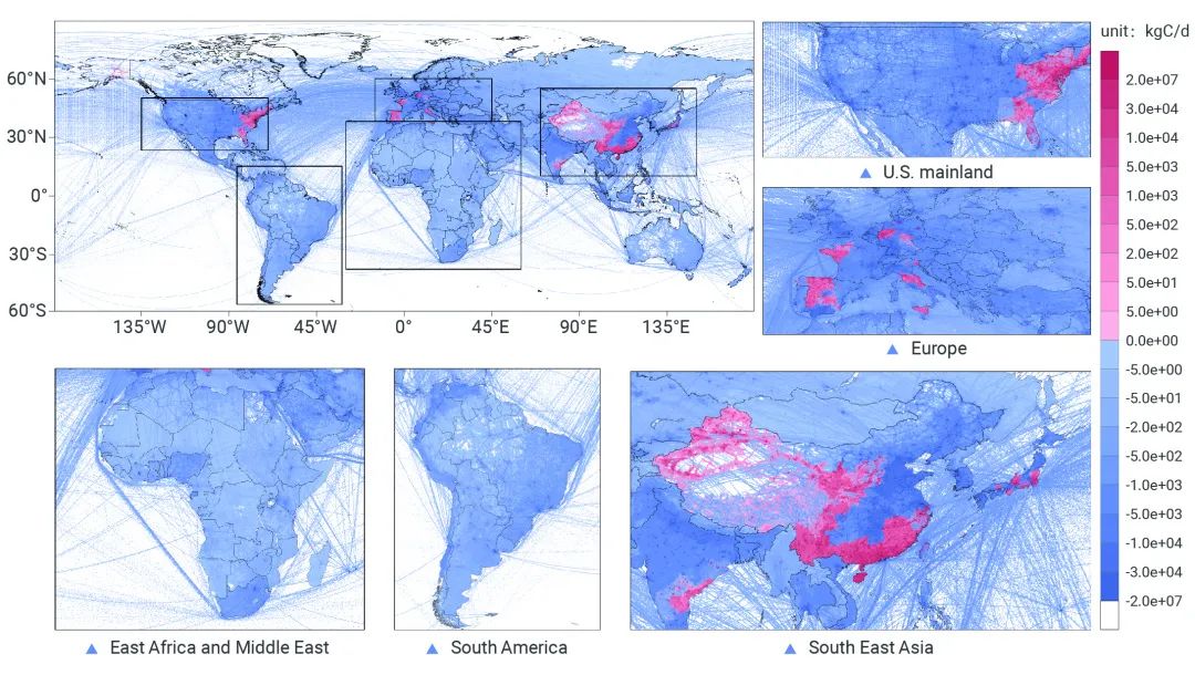 近實(shí)時全球碳地圖反映出人類活動變化導(dǎo)致的碳排放時空動態(tài)變化特征,包括氣候、季節(jié)、節(jié)假日甚至是新冠疫情對碳排放的實(shí)時動態(tài)變化。