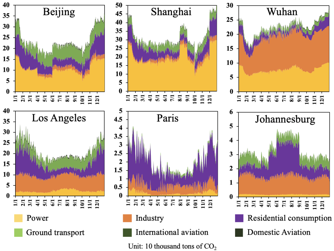 GRACED覆蓋了全球重點(diǎn)城市在內(nèi)的關(guān)鍵排放區(qū)域,并量化表征分部門排放的時空動態(tài)特征。數(shù)據(jù)顯示,2020年中國的北京、上海、武漢城市的碳排放量在1月末首先受疫情沖擊,出現(xiàn)明顯下降,但在疫情得到控制后趨于平穩(wěn)。而洛杉磯、巴黎、約翰內(nèi)斯堡受疫情沖擊相對較晚,在4、5月份才出現(xiàn)排放顯著下降(圖7)。