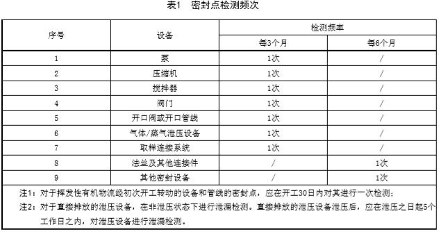 氣體、輕液接觸或流經(jīng)的密封點檢測頻次最低應符合企業(yè)所屬行業(yè)標準規(guī)定的檢測頻次,所屬行業(yè)未發(fā)布標準,執(zhí)行表1的檢測頻次。