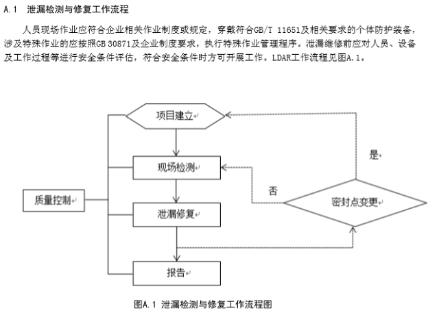 LDAR工作流程包括項目建立(資料收集、密封點識別、密封點檔案建立)、現(xiàn)場檢測和泄漏修復等 步驟。若企業(yè)因開停工、檢維修以及改擴建等原因發(fā)生密封點變更的,需重新建立密封點檔案后開展現(xiàn) 場檢測和泄漏修復工作。LDAR工作流程按照附錄A進行。