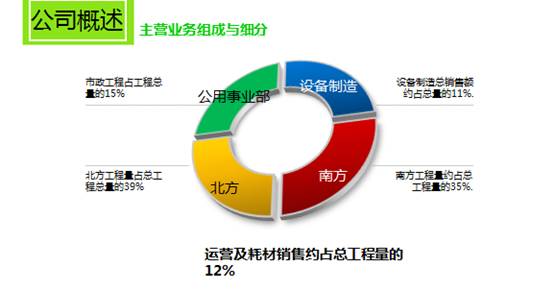 如上圖可見,紫科的主要業(yè)務(wù)細(xì)分為四大板塊,第一是設(shè)備制造,設(shè)備制造總銷售額約占總量的11%;第二是公用事業(yè)板塊,市政工程占工程總量的15%,在全國主要有兩個點(diǎn)。第一點(diǎn)在廣州總部,第二點(diǎn)在北京,這兩點(diǎn)一線負(fù)責(zé)全國市政的推廣;第三是北方板塊主要是工業(yè)板塊,總部在山東濰坊,是我們的全資子公司,北方工程量占總工程總量的39%;第四是南方板塊,總部在南京,南方工程量約占總工程量的35%。在運(yùn)營和耗材的銷售,從2015年開始已經(jīng)占到總銷售額的12%。