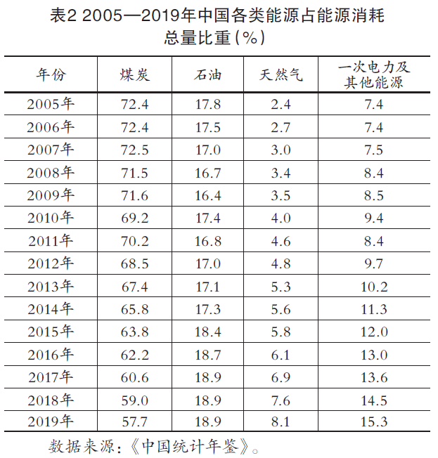 近年來(lái),中國(guó)一次能源消費(fèi)結(jié)構(gòu)呈現(xiàn)出明顯的低碳化、清潔化趨勢(shì)(見(jiàn)表2)。2005—2019年煤炭消費(fèi)量比重從72.4%下降至57.7%,共下降14.7個(gè)百分點(diǎn);天然氣消費(fèi)量則從2.4%提高到8.1%,清潔能源(一次電力及其他能源)消費(fèi)量從7.4%提高到15.3%,合計(jì)占比提高13.6個(gè)百分點(diǎn)。