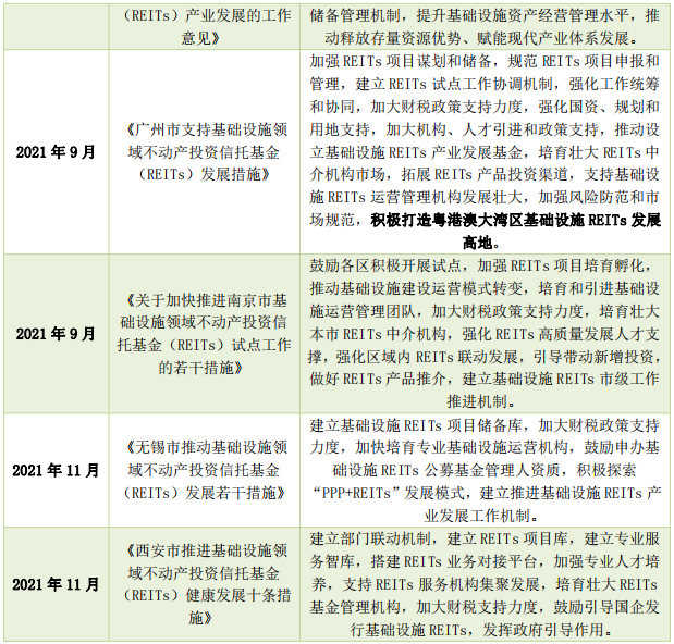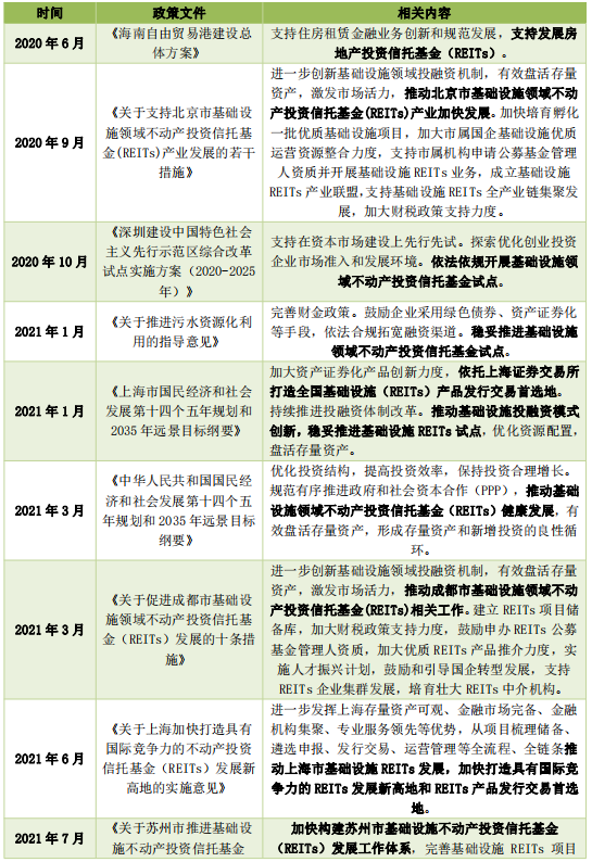 另外,中央、地方政府出臺的部分政策文件、省市區(qū)域的遠(yuǎn)景規(guī)劃也將REITs列為重要內(nèi)容之一,推動REITs在重點(diǎn)省份、城市與行業(yè)的應(yīng)用和推廣。部分核心一、二線城市如北京、上海、成都、蘇州也相繼推出促進(jìn)本市及所在區(qū)域的基礎(chǔ)設(shè)施REITs發(fā)展的政策或?qū)嵤┐胧?,?gòu)建本市基礎(chǔ)設(shè)施REITs發(fā)展工作體系,推動地方基礎(chǔ)設(shè)施REITs健康持續(xù)發(fā)展。