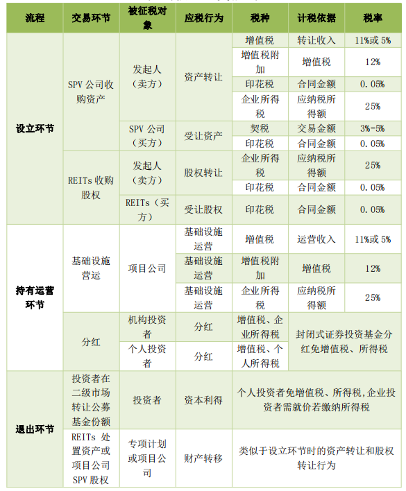 REITs的運(yùn)作主要包括三個環(huán)節(jié):即設(shè)立(資產(chǎn)重組、股權(quán)轉(zhuǎn)讓)環(huán)節(jié)、持有運(yùn)營環(huán)節(jié)和退出環(huán)節(jié),涉及的稅種包括:印花稅、企業(yè)所得稅、契稅、增值稅等。其中,基礎(chǔ)設(shè)施REITs面臨的稅收問題主要是資產(chǎn)重組環(huán)節(jié)涉及的土地增值稅和股權(quán)轉(zhuǎn)讓環(huán)節(jié)涉及的企業(yè)所得稅。設(shè)立REITs通常需對基礎(chǔ)設(shè)施資產(chǎn)進(jìn)行資產(chǎn)重組,并被視為交易行為,需繳納相關(guān)稅費(fèi)。如果涉及土地轉(zhuǎn)讓的,原則上則應(yīng)當(dāng)征收土地增值稅。而在部分國家,對于REITs底層資產(chǎn)的契稅、印花稅等稅種有減免,在我國針對REITs底層資產(chǎn)的稅收減免缺失。