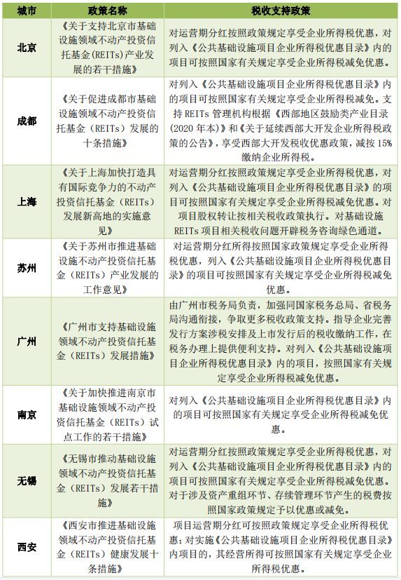 值得關(guān)注的是,在北京、上海、成都等城市發(fā)布的REITs推動政策或?qū)嵤┐胧┮呀?jīng)開始關(guān)注REITs稅收問題,并出臺了針對性地稅收支持政策助力REITs發(fā)行與持有。包括對基礎(chǔ)設(shè)施REITs項(xiàng)目相關(guān)稅收問題開辟稅務(wù)咨詢綠色通道;在資產(chǎn)重組環(huán)節(jié)產(chǎn)生稅費(fèi)予以優(yōu)惠;在運(yùn)營期對項(xiàng)目公司及管理機(jī)構(gòu)經(jīng)營所得予以所得稅優(yōu)惠;在分紅環(huán)節(jié)對于投資者分紅予以所得稅優(yōu)惠等。