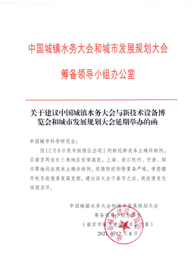 為切實保障與會專家學者、參會參展代表的健康安全,經(jīng)組委會慎重研究決定,原延期至2021年12月16日-17日在南京同期舉辦的“2021(第十六屆)中國城鎮(zhèn)水務(wù)發(fā)展國際研討會與新技術(shù)設(shè)備博覽會”和“2021(第十六屆)城市發(fā)展與規(guī)劃大會”很遺憾將延期召開,具體視疫情變化擇期召開。
