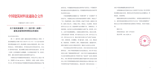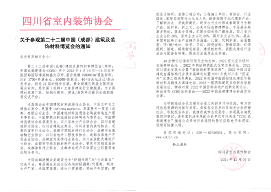 第二十二屆中國(成都)建筑及裝飾材料博覽會(以下簡稱:第二十二屆中國成都建博會)將于2022年4月14-16日在中國西部國際博覽城舉辦,15萬平米展出面積、預(yù)計1700+展商、120000參觀人次,目前展位預(yù)定已超85%。為打造“經(jīng)銷代理”與“公裝集采”的優(yōu)選商貿(mào)平臺,本屆展會現(xiàn)在已全渠道全面開啟線上線下宣傳推廣、專業(yè)觀眾邀請,深度覆蓋以四川為中心的西南各省市,觀眾群體涵蓋建材家居行業(yè)生產(chǎn)廠商、經(jīng)銷代理商、零售商、設(shè)計師、裝飾工程、開發(fā)商、建筑工程等,滿足參展企業(yè)招經(jīng)銷代理需求的同時更助力參展企業(yè)實現(xiàn)公裝集采貿(mào)易對接。