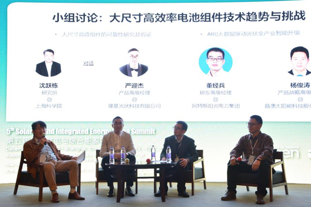 下午的小組討論主題為:大尺寸高效率電池組件技術(shù)趨勢(shì)與挑戰(zhàn),該討論由上海科學(xué)院研究員沈躍棟主持,隆基光伏科技有限公司產(chǎn)品高級(jí)經(jīng)理嚴(yán)迎杰、阿特斯陽光電力集團(tuán)研發(fā)高級(jí)經(jīng)理董經(jīng)兵、晶澳太陽能科技股份有限公司產(chǎn)品戰(zhàn)略高級(jí)經(jīng)理?xiàng)羁e極參與了討論。嘉賓們圍繞大尺寸高效組件的可靠性研究及驗(yàn)證、AI和大數(shù)據(jù)驅(qū)動(dòng)光伏全產(chǎn)業(yè)智能升級(jí)等話題展開了交流和探討。臺(tái)上臺(tái)下積極互動(dòng),將第一天的會(huì)議推向了高潮。