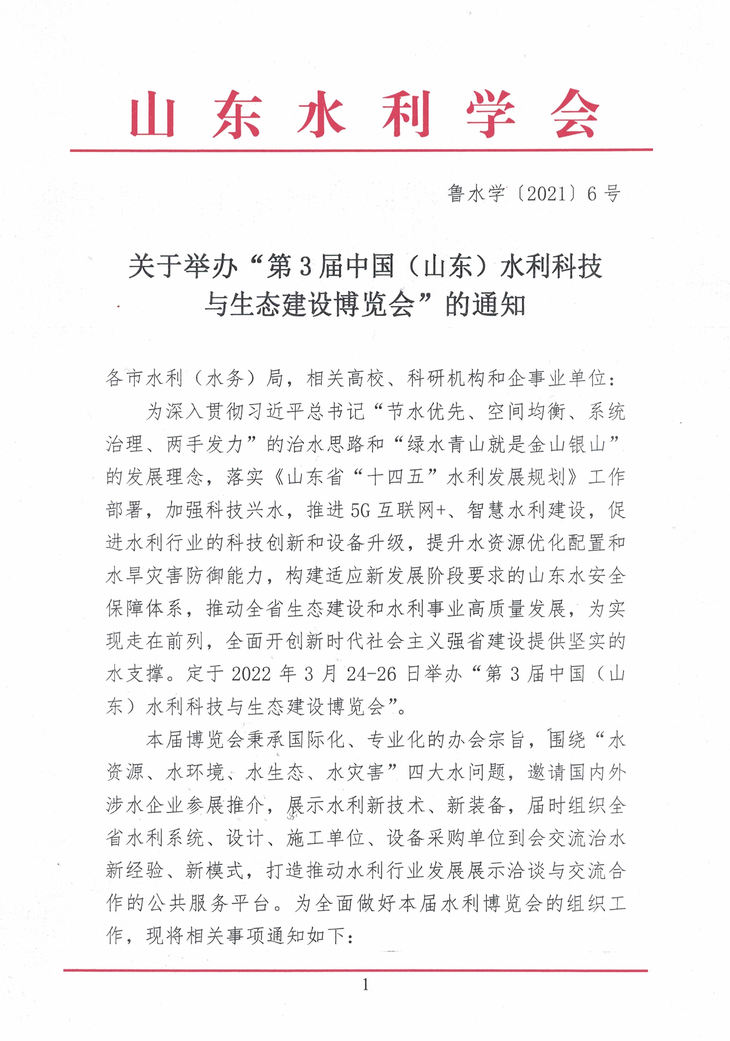 2021年12月6日,山東水利學(xué)會印發(fā)2021年6號文件,第3屆中國(山東)水利科技與生態(tài)建設(shè)博覽會的各項工作正式開始。誠邀各水利與生態(tài)建設(shè)相關(guān)企業(yè)報名參展,歡迎各水利同仁到會參觀。2022年3月24-26日,“紅瓦綠樹,碧海藍(lán)天”的青島歡迎您!