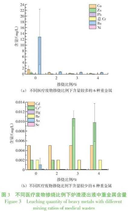 圖3(a)表示了不同比例摻雜醫(yī)療廢物爐渣含量較多的重金屬浸出情況,可見醫(yī)療廢物的摻入對(duì)Cu和Ba的浸出影響較為明顯,隨著醫(yī)療廢物摻入比例的增加,Cu的浸出量明顯降低,從1.6 mg/L降低到0.33 mg/L。Ba浸出量降低的趨勢更加明顯,從12.82 mg/L降低到0.64~0.89 mg/L,這是由于生活垃圾成分復(fù)雜,分類不夠徹底時(shí),部分灰土、玻璃、磚瓦陶瓷、金屬類垃圾等成分會(huì)嚴(yán)重影響爐渣中的Ba元素含量,但是醫(yī)療廢物中并不存在這些組分,因此Ba的浸出濃度降低明顯。摻燒醫(yī)療廢物后爐渣中Zn的含量與原爐渣比也有所降低,但不同醫(yī)廢摻燒比例下的Zn含量變化不大,在0.1~0.2 mg/L范圍波動(dòng)。Long等研究了中國城市垃圾中重金屬的分布,指出廚余、灰渣、塑料以及紙張占垃圾總量的55.1%~99.5%,并且這幾種垃圾組分中的Cu及Zn含量分別占垃圾總量的 76.3%和 82.3%。醫(yī)療廢物這些組分相對(duì)較少,所以Cu和Zn的含量略有降低。摻入醫(yī)療廢物混燒后,其他重金屬浸出濃度相對(duì)較少,并無明顯變化。爐渣中含量較多的重金屬,含量高低依次為:Ba>Zn>Cu。但是其浸出濃度遠(yuǎn)遠(yuǎn)低于GB 5085.3—2007危險(xiǎn)廢物鑒別標(biāo)準(zhǔn) 浸出毒性鑒別的限值。