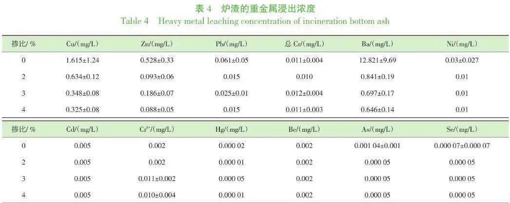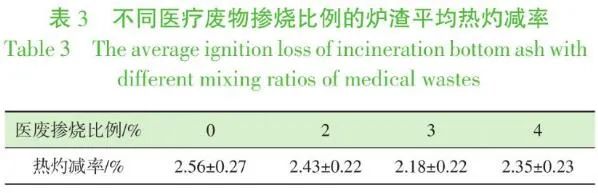 如表3所示,日常焚燒生活垃圾爐渣平均熱灼減率為2.56%,而摻燒醫(yī)療廢物的爐渣范圍是2.18%~2.43%,較原爐渣略有下降,這是因?yàn)獒t(yī)療廢物熱值較高,可促進(jìn)爐渣中的碳燃盡。