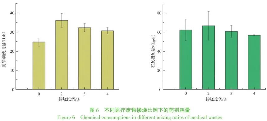 由圖4可以看出,生活垃圾日常運(yùn)行熱處理焚燒煙氣中CO本身含量較低,平均為1.72 mg/m3,遠(yuǎn)低于排放標(biāo)準(zhǔn)的限值。摻燒醫(yī)療廢物后煙氣中CO含量顯著升高,當(dāng)摻燒比例為3%時(shí),CO平均含量達(dá)13.78 mg/m3,是日常運(yùn)行工況下的8倍,但是仍然遠(yuǎn)低于標(biāo)準(zhǔn)值,其上偏差雖然有7.33 mg/m3,但是仍低于排放限值。2%和4%的摻燒比例下,煙氣中CO的含量增加,分別是日常運(yùn)行條件下的3.8倍和2.2倍,但是明顯低于摻燒比例為3%的工況。顯著性分析發(fā)現(xiàn)P<0.05,說明摻燒醫(yī)療廢物對(duì)焚燒煙氣中CO含量有明顯影響,且呈現(xiàn)增加的趨勢。這是因?yàn)獒t(yī)療廢物的熱值偏高,即使在供風(fēng)相應(yīng)地調(diào)整前提下,可能會(huì)因?yàn)榫植繜嶝?fù)荷高、在高溫區(qū)停留時(shí)間縮短而引起CO升高。 醫(yī)療廢物的Cl典型含量為1.1%~2.1%,而生活垃圾在0.2%~0.8%的水平。但是表2中數(shù)據(jù)顯示醫(yī)療廢物的Cl含量雖然偏高,但是未達(dá)到上述水平,這可能與醫(yī)療廢物的來源及取樣有關(guān)。由圖5可以看出,日常運(yùn)行焚燒煙氣中HCl平均含量為3.32 mg/m3,在生活垃圾中摻燒醫(yī)療廢物后煙氣中HCl含量略有降低,這可能是因?yàn)檫M(jìn)料波動(dòng)引起的。在2%摻燒比例下煙氣中HCl含量變化不大,僅為3.30 mg/m3,基本與日常運(yùn)行條件下的含量持平,但是石灰投加量有所增加,如圖6所示。摻燒比例為3%和4%時(shí),HCl濃度反而降低明顯,對(duì)應(yīng)地石灰的消耗量也有所降低,這可能與生活垃圾的組分波動(dòng)有關(guān),因?yàn)閾綗囼?yàn)時(shí)間長達(dá)8 d,生活垃圾組分和醫(yī)療廢物組分均可能出現(xiàn)變化,也說明垃圾組分本身的波動(dòng)可能掩蓋小比例的醫(yī)療廢物摻燒的影響。