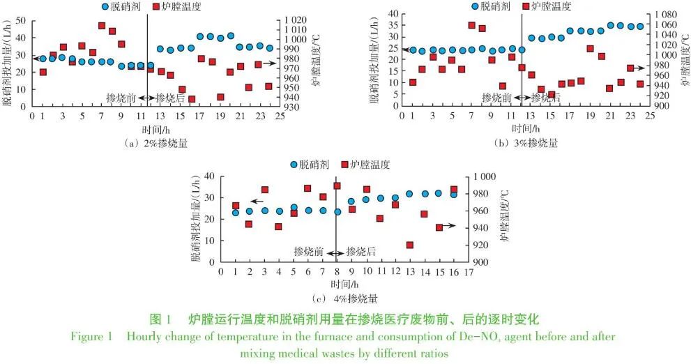 這里主要關(guān)注醫(yī)療廢物摻燒對(duì)焚燒爐爐膛溫度和焚燒處理量的影響。圖1給出每個(gè)摻燒比例前后的爐膛溫度和脫硝劑用量的逐時(shí)變化。其中摻燒比例為2%和3%(wt)時(shí),前12 h為日常運(yùn)行情況,后12 h為摻燒后的代表性工況;摻燒比例為4%(wt)時(shí),前8 h為日常運(yùn)行情況,后8 h為摻燒后的代表性工況。將上述逐時(shí)溫度按照不同醫(yī)療廢物添加量工況取平均值,結(jié)果見圖2,圖2同時(shí)給出了實(shí)際的入爐垃圾焚燒量??梢姡粘_\(yùn)行爐膛內(nèi)溫度較高,平均可達(dá)982.72 ℃,在摻燒醫(yī)療廢物后爐膛溫度略有降低,這可能是由于供風(fēng)量隨著醫(yī)療廢物摻燒比例的增加而增大引起的變化,但是不同摻燒比例下運(yùn)行溫度變化不大,無顯著性差異,總體上運(yùn)行溫度在正常波動(dòng)范圍內(nèi),并高于850 ℃。