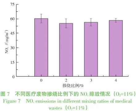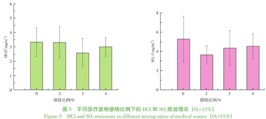 爐渣主要用于建筑材料,摻燒4%及以下的醫(yī)療廢物,從重金屬的浸出來看基本上不影響其用途。因此巴塞爾公約也推薦醫(yī)療廢物可在生活垃圾焚燒爐中應(yīng)急處置。 不同醫(yī)療廢物摻燒比例下CO排放情況見圖4。