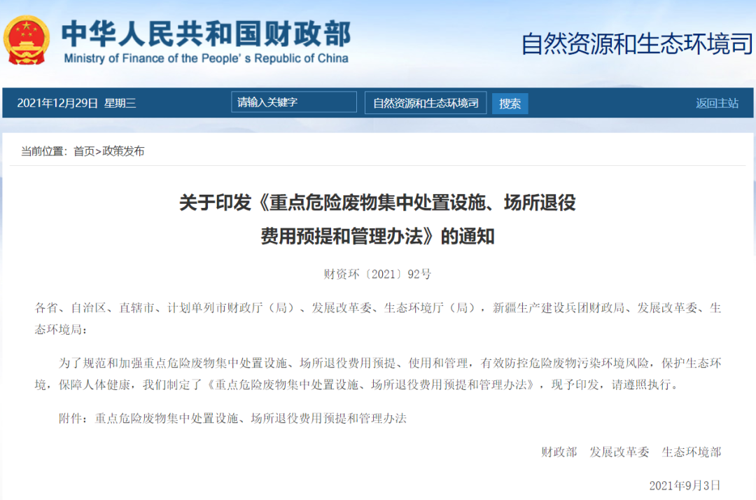 重點(diǎn)危險(xiǎn)廢物集中處置設(shè)施、場所退役費(fèi)用預(yù)提和管理辦法