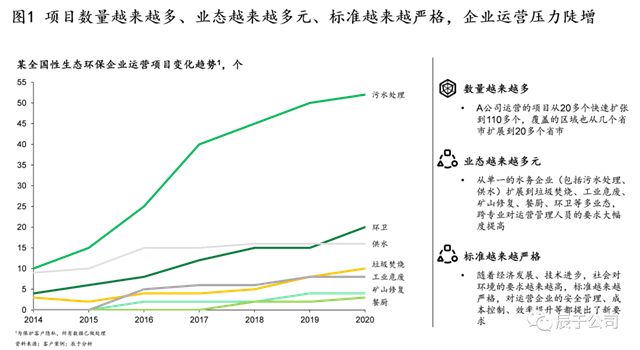 近幾年來,一批環(huán)保企業(yè)蓬勃發(fā)展,規(guī)模迅速擴(kuò)張,他們所持有的項(xiàng)目數(shù)量越來越多,業(yè)態(tài)越來越多元。以我們服務(wù)的某全國性生態(tài)環(huán)保企業(yè)為例,2014-2020年間,運(yùn)營項(xiàng)目從20多個(gè)增加到100多個(gè),覆蓋區(qū)域從8個(gè)省市擴(kuò)張到20多個(gè),業(yè)態(tài)也從單一的污水、供水,延伸到垃圾焚燒、工業(yè)危廢、礦山修復(fù)、餐廚、環(huán)衛(wèi)等“水、固、生態(tài)修復(fù)”協(xié)同發(fā)展(見圖1)。