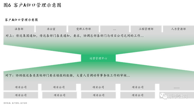 我們也看到,對(duì)項(xiàng)目公司的管理,一些企業(yè)簡(jiǎn)單的劃分為建設(shè)階段的項(xiàng)目公司由工程管理部門統(tǒng)籌管理、運(yùn)營階段的則由運(yùn)營管理部門統(tǒng)籌管理,對(duì)上“傳達(dá)集團(tuán)通知,傳達(dá)各部門各類通知、要求,協(xié)調(diào)總部各部門與項(xiàng)目公司之間的工作”,對(duì)下“協(xié)助報(bào)送各類其他部門要求填報(bào)的數(shù)據(jù),大量人員調(diào)動(dòng)等事務(wù)性工作的審核”等,原本簡(jiǎn)單的總部-項(xiàng)目公司兩級(jí)架構(gòu),演變成總部其他部門——總部(工程)運(yùn)營管理部門——(工程期)運(yùn)營期項(xiàng)目公司“漏斗型”三級(jí)架構(gòu) (見圖6)。