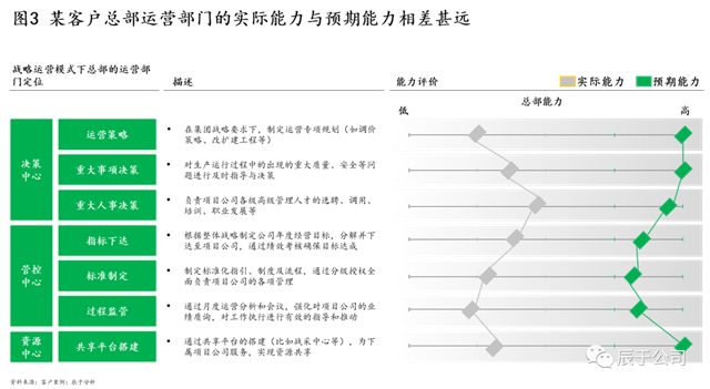 造成以上問題的根本原因是管理沒有跟著業(yè)務(wù)走,各級(jí)主體的角色定位沒有跟著公司發(fā)展而變化,該總部管的沒有管好,不需總部管的管太多。領(lǐng)先實(shí)踐表明,隨著一些企業(yè)的業(yè)務(wù)多元發(fā)展,總部定位也需要逐步從運(yùn)營管控往戰(zhàn)略運(yùn)營管控轉(zhuǎn)型,做好“決策、管控、資源共享”等中心定位,但有些企業(yè)的管理變革顯然沒有緊隨其后(見圖3)。