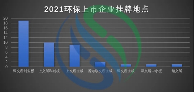 根據(jù)統(tǒng)計數(shù)據(jù)顯示,43家企業(yè)中,選擇在創(chuàng)業(yè)板上市的企業(yè)有19家,在科創(chuàng)板上市的企業(yè)有10家,在上交所主板上市的企業(yè)有9家,在香港聯(lián)交所主板上市的有2家,在深交所主板上市的有1家,在深交所中小板上市的1家,在紐交所上市1家。從2021年新增環(huán)保上市公司的上市渠道來看,實施股票注冊制的創(chuàng)業(yè)板與科創(chuàng)板已成為優(yōu)選上市板塊。