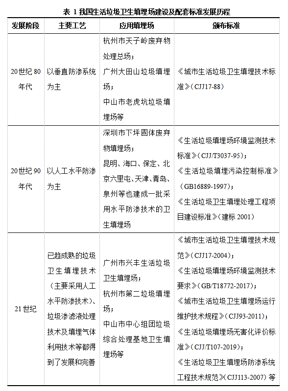 我國生活垃圾衛(wèi)生填埋技術(shù)主要經(jīng)歷了三個階段:20世紀80年代以垂直防滲為主的衛(wèi)生填埋場、20世紀90年代以水平防滲為主的衛(wèi)生填埋場、21世紀垃圾衛(wèi)生填埋技術(shù)、垃圾滲濾液處理技術(shù)及填埋氣體利用技術(shù)完善的衛(wèi)生填埋場,建設(shè)及配套標準見表1[1]。