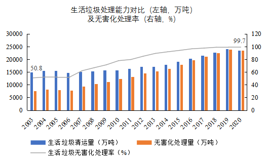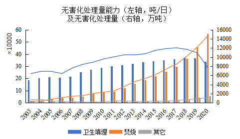 圖 1我國2003-2020年生活垃圾清運量及無害化處理能力(數(shù)據(jù)來源:中國統(tǒng)計年鑒)