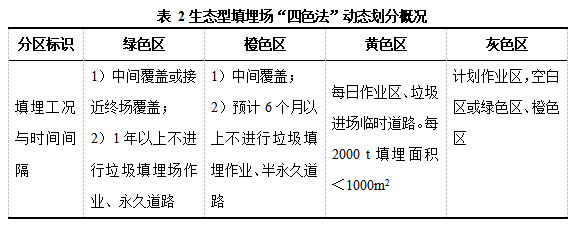 垃圾填埋場的生命周期主要分為三個階段:建設(shè)階段、運行階段和封場修復(fù)階段。垃圾填埋場應(yīng)根據(jù)《生活垃圾衛(wèi)生填埋場處理工程項目建設(shè)標準》(建標124-2009)建設(shè),建設(shè)項目主要包括填埋場主體工程與設(shè)備、配套工程和生產(chǎn)管理與輔助設(shè)施及生活服務(wù)設(shè)施等,建設(shè)完成后進入運行階段。衛(wèi)生填埋場運行管理應(yīng)符合《生活垃圾填埋場運行管理規(guī)范》(DB11/T 270-2014)。在運行階段,生態(tài)型填埋場采用 “四色法”(國作登字-2020-L-01092309)對填埋場進行動態(tài)劃分,即綠色區(qū)、黃色區(qū)、灰色區(qū)和橙色區(qū),詳見表2。