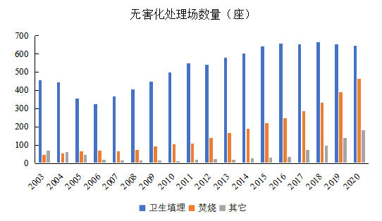 圖2 我國2003-2020年不同類型的無害化處理場數(shù)量(數(shù)據(jù)來源:中國統(tǒng)計年鑒)
