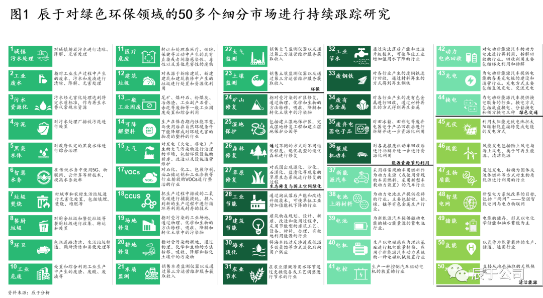 作為一家聚焦于綠色發(fā)展領(lǐng)域的專業(yè)咨詢機(jī)構(gòu),結(jié)合以往項(xiàng)目經(jīng)驗(yàn)以及業(yè)內(nèi)習(xí)慣,辰于對綠色環(huán)保行業(yè)范圍進(jìn)行了明確劃分,目前已經(jīng)持續(xù)跟蹤50多個(gè)細(xì)分領(lǐng)域(見圖1)。有意思的一點(diǎn)是,過去的環(huán)保行業(yè)范圍一般是指包含供水、各類污染物末端處置和治理以及環(huán)境監(jiān)測在內(nèi)的傳統(tǒng)環(huán)保領(lǐng)域,雙碳戰(zhàn)略提出后,當(dāng)人們談到“環(huán)?!睍r(shí),更多是指“綠色環(huán)?!钡母拍?,節(jié)能、清潔能源、雙碳業(yè)務(wù)等行業(yè)也被納入。