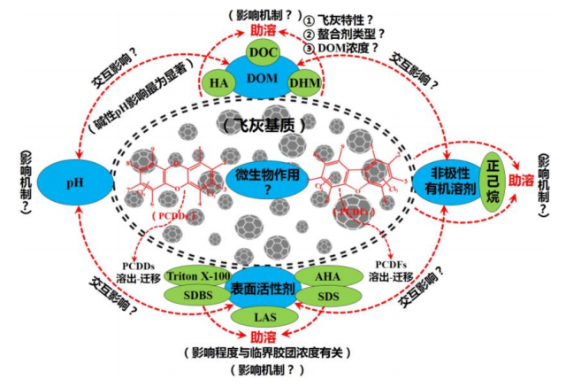 相關(guān)研究表明,溶解性有機物(DOM):如DOC(溶解性有機碳),DHM(溶解性腐殖類物質(zhì))和HA(腐殖酸類)等、pH、表面活性劑、非極性有機溶劑和微生物作用對飛灰中二噁英的溶出均有一定的影響。填埋處置環(huán)境中影響飛灰中PCDD/Fs溶出的主要因素及其相互作用關(guān)系如圖2所示。 圖2 填埋處置環(huán)境中影響飛灰中PCDD/Fs溶出的主要因素及其相互作用關(guān)系