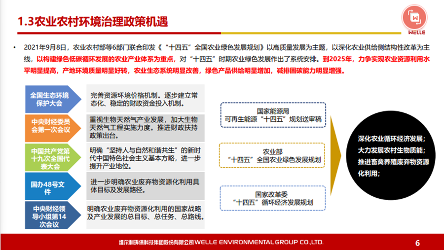 本文圍繞碳中和背景下的政策機(jī)遇、城鄉(xiāng)有機(jī)廢棄物資源化的的主要處理方法和路徑等內(nèi)容展開,同時(shí)對(duì)維爾利集團(tuán)概況和發(fā)展歷程做了簡(jiǎn)要回顧。 2021年10月20-21日,2021年中國(guó)沼氣學(xué)會(huì)學(xué)術(shù)年會(huì)暨中德沼氣合作論壇在南京舉行。作為2021年中國(guó)沼氣學(xué)會(huì)學(xué)術(shù)年會(huì)的承辦單位,維爾利環(huán)??萍技瘓F(tuán)股份有限公司董事長(zhǎng)李月中博士以《城鄉(xiāng)有機(jī)廢棄物資源化路徑探討》為主題,與大家一起探討了碳中和背景下城鄉(xiāng)有機(jī)廢棄物資源化的發(fā)展與未來(lái)。報(bào)告圍繞碳中和背景下的政策機(jī)遇、城鄉(xiāng)有機(jī)廢棄物資源化的的主要處理方法和路徑等內(nèi)容展開,同時(shí)對(duì)維爾利集團(tuán)概況和發(fā)展歷程做了簡(jiǎn)要回顧。本文根據(jù)其發(fā)言整理。▼維爾利環(huán)??萍技瘓F(tuán)股份有限公司董事長(zhǎng) 李月中各位領(lǐng)導(dǎo)、各位專家、各位同仁,大家上午好!今天有幸代表維爾利集團(tuán)和大家做交流,作為會(huì)議的承辦方,也感謝中國(guó)沼氣學(xué)會(huì)、南京大學(xué)、德國(guó)沼氣協(xié)會(huì)給維爾利這個(gè)機(jī)會(huì)。維爾利作為專業(yè)的企業(yè),實(shí)際上歷史并不是很長(zhǎng),但是我們對(duì)沼氣和厭氧技術(shù)這塊有自己的獨(dú)到見解。作為一個(gè)商業(yè)機(jī)構(gòu),企業(yè)怎么能夠在競(jìng)爭(zhēng)行業(yè)里生存和發(fā)展?在這里和大家做一些交流,和大家一起思考,同時(shí)希望在座的同仁能夠在這個(gè)行業(yè)相對(duì)比較困難的情況下抱團(tuán)取暖。2020年9月,國(guó)家主席習(xí)近平在聯(lián)合國(guó)大會(huì)上提出“二氧化碳排放力爭(zhēng)于2030年前達(dá)到峰值,努力爭(zhēng)取2060年前實(shí)現(xiàn)碳中和”。2021年3月15日,習(xí)近平總書記主持召開中央財(cái)經(jīng)委員會(huì)第九次會(huì)議并發(fā)表重要講話強(qiáng)調(diào),要把碳達(dá)峰、碳中和納入生態(tài)文明建設(shè)整體布局,拿出抓鐵有痕的勁頭,如期實(shí)現(xiàn)2030年前碳達(dá)峰、2060年前碳中和的目標(biāo)。從能源結(jié)構(gòu)上來(lái)說(shuō),有機(jī)垃圾資源化產(chǎn)生的生物質(zhì)能源在實(shí)現(xiàn)雙碳目標(biāo)上具有獨(dú)特意義。這實(shí)際上也是倒推企業(yè)行業(yè)轉(zhuǎn)型。對(duì)大家來(lái)說(shuō),“碳達(dá)峰碳中和”既是一個(gè)挑戰(zhàn)也是一個(gè)機(jī)會(huì)。這里面包括了現(xiàn)在我們推出的對(duì)城市環(huán)境,對(duì)農(nóng)村農(nóng)業(yè)環(huán)境可能存在的機(jī)會(huì),這些機(jī)會(huì)對(duì)環(huán)保產(chǎn)業(yè)來(lái)說(shuō),個(gè)人認(rèn)為受到政策影響比較大。為什么德國(guó)2016年在農(nóng)業(yè)生物天然氣領(lǐng)域有下滑?是因?yàn)槟承┱叱霈F(xiàn)了不到位的情況,一些企業(yè)就不愿意去做。在碳達(dá)峰、碳減排的前提下,我們有很多的機(jī)會(huì),但這個(gè)機(jī)會(huì)要真正落實(shí),還是要國(guó)家從頂層設(shè)計(jì)到具體的政策到位,才能夠使這個(gè)行業(yè)有比較好的發(fā)展。在城市環(huán)境治理領(lǐng)域,城市有機(jī)廢棄物(垃圾量)非常大。上海實(shí)施垃圾分類以后,2020年上海濕垃圾的產(chǎn)生量是每天在9500-10000噸左右,也就是說(shuō)1/3為濕垃圾。這對(duì)焚燒廠來(lái)說(shuō),是一個(gè)巨大的減負(fù),但同時(shí)對(duì)處理能力也有了條件限制。我們深度參與了這方面工作,現(xiàn)在上海的處理能力大概為4000噸左右,意味著上海的濕垃圾處理能力還有60%在建,徹底實(shí)現(xiàn)垃圾分類的路還很遠(yuǎn)。北京情況更為嚴(yán)重。原來(lái)北京只有幾個(gè)堆肥廠,原來(lái)只是三相做一點(diǎn)小的堆肥,如果真的要實(shí)現(xiàn)垃圾源頭分類,大概4、5千噸的垃圾處理設(shè)施要重新建設(shè)。在農(nóng)業(yè)農(nóng)村環(huán)境治理領(lǐng)域,包括農(nóng)產(chǎn)品加工這方面,整個(gè)市場(chǎng)規(guī)??赡芨?。各位前輩都已經(jīng)做了一些介紹,我們是不是能夠全部實(shí)現(xiàn)資源化處理,是值得商榷的。對(duì)于不同的原料,我們應(yīng)該怎么處理?作為企業(yè),我們推行起來(lái)還是有一定的難度。我們現(xiàn)在的這些大型的沼氣項(xiàng)目,它的源頭、原料、收益、收益成本,包括最終的產(chǎn)品出路,收集半徑到底多少是最合理的?實(shí)際上是需要根據(jù)不同有機(jī)廢棄物的種類以及最終產(chǎn)品的出路來(lái)規(guī)劃項(xiàng)目規(guī)模,而不是按照政策要求。比如一萬(wàn)方的沼氣工程才稱得上大型沼氣項(xiàng)目,才有補(bǔ)貼,這樣的項(xiàng)目就不一定能夠真正地實(shí)現(xiàn)盈利。 下面大概講一講我們最近對(duì)城鄉(xiāng)有機(jī)廢棄物資源化的主要處理方法和路徑。