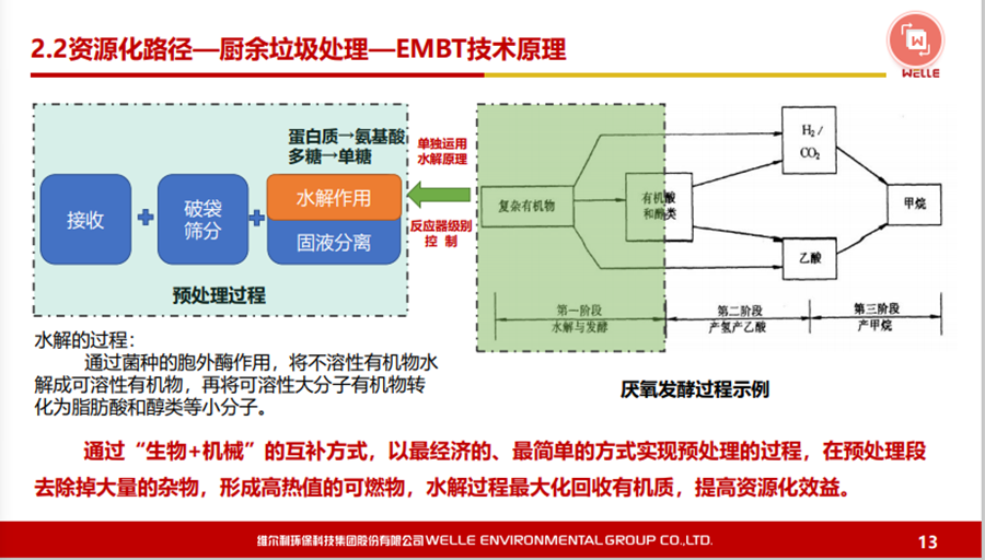 對(duì)于有機(jī)廢棄物的原料及核心技術(shù),可以說(shuō)從城市有機(jī)廢棄物到農(nóng)村有機(jī)廢棄物,現(xiàn)在最核心的還是通過(guò)厭氧發(fā)酵技術(shù),最終通過(guò)沼氣化利用,達(dá)到無(wú)害化或者是環(huán)?;?,再盡可能實(shí)現(xiàn)資源化。國(guó)家發(fā)改委推出了一百個(gè)餐廚垃圾處理試點(diǎn)項(xiàng)目,之后進(jìn)行全方位地推出。在國(guó)內(nèi)真正運(yùn)行好的餐廚垃圾項(xiàng)目并不是特別多,主要工藝還是以厭氧為主。為什么這塊資源化的效率會(huì)好一些?尤其在“碳減排”的壓力下,使得出口價(jià)格一直比較好,這個(gè)行業(yè)最近稍微能夠掙點(diǎn)錢。另外,更深度的資源化利用,比如做有機(jī)質(zhì),食用的昆蟲養(yǎng)殖,也會(huì)有一些收益,再加上沼氣的收益。對(duì)于餐廚垃圾處理,我認(rèn)為如果到了一定規(guī)模,收益還是不錯(cuò)的。相對(duì)來(lái)說(shuō),廚余垃圾的資源化利用效率會(huì)差一些?,F(xiàn)在全國(guó)都在推行垃圾分類,不同城市廚余垃圾的質(zhì)量相差比較大。如上海的廚余垃圾含水率、油脂含量與餐廚垃圾是有一點(diǎn)類似的,含油量可能稍微小一點(diǎn),但在其他城市就相差非常大。廚余垃圾資源化是節(jié)省能源化的利用,以無(wú)害化為主,有一些也可以做食用昆蟲的養(yǎng)殖。 對(duì)于濕垃圾或者是廚余垃圾,我們特別推出一款技術(shù)——EMBT技術(shù)。結(jié)合生物水解技術(shù),原理是有機(jī)廢棄物或者有機(jī)物在厭氧發(fā)酵過(guò)程當(dāng)中主要是通過(guò)酸化水解以及產(chǎn)甲烷兩個(gè)階段,我們通過(guò)設(shè)施化的反應(yīng)器,把酸化水解在前面就能夠作為預(yù)處理,真正地溶解到水下面的有機(jī)物再到厭氧處理,這樣使得厭氧反應(yīng)器不要那么復(fù)雜,剩下的固渣資源化也會(huì)比較方便,去做水量化的利用都是可行的。這個(gè)工藝現(xiàn)在在上海包括在紹興做下來(lái),還是受到比較多的認(rèn)可。
